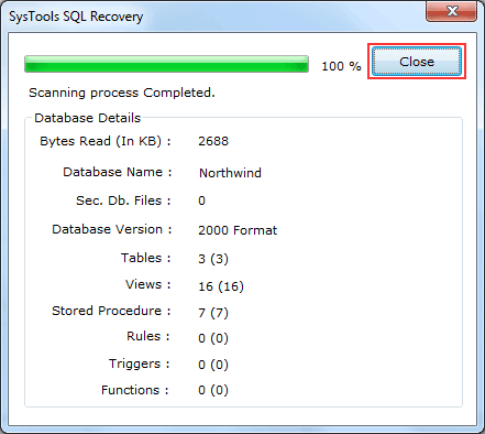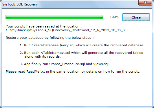 You should click on Close button and then navigate the saving location for finding the recovered sql script file.